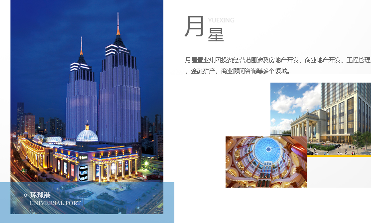 月星商業集團從事建設、運營大型商業地產和城市綜合體項目,目前已建和在建的開發項目遍布上海、江蘇、遼寧、安徽、新疆等省市。其中,全球中心城區規模最大的購物中心——48萬平方米的上海環球港已經于2013年開業迎客, 88萬平方米的“中國1MALL”—常州月星環球港也即將開業,標志著月星集團進入新一輪快速發展期。