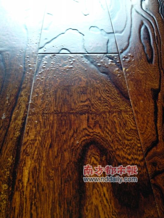 記者跑腿:五一期間,南都記者來到周先生家中,160多平方米的房間共有100多平方米鋪了防潮復合木地板,客廳及幾個房間內的木地板有凹凸不平的印記,部分地板向上部凸起,仿佛泡過水一般。