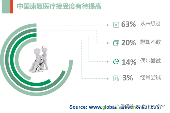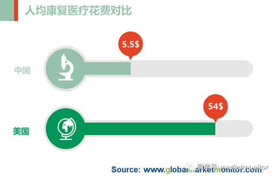 由于國內(nèi)康復行業(yè)發(fā)展晚,且受國民觀念影響,國內(nèi)康復市場沒有得到充分開發(fā)。從兩個方面可以看出,一是現(xiàn)階段國民對醫(yī)療康復的認識度和接受度較低,二是國民人均康復花費低,康復滲透率遠遠低于歐美發(fā)達國家。