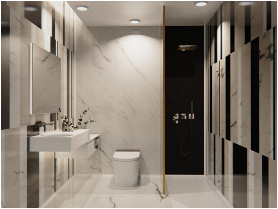 創品高人造石具有獨特的美感和優越的物理性能。它可以打造出光滑無孔無縫的墻面和地面。在墻面上加入米色和黑色的雙色拼接,為整個浴室空間增添生動和活力。這種巧妙的設計不僅增加了視覺趣味性,還激發了空間的活力和熱情。米色象征著溫暖和舒適,給人一種寧靜的感覺,而黑色則顯得穩重和神秘,為空間添加了現代感。兩種顏色的融合形成了鮮明的對比,引發了空間的視覺張力,使得整個浴室煥發出活力。