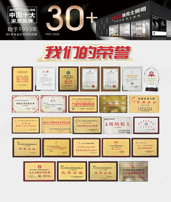 澳克士照明扎根中山古鎮(zhèn)燈都,從1993年建廠,發(fā)展至今已30多年,先后榮獲“廣東省守合同重信用企業(yè)”“古鎮(zhèn)鎮(zhèn)規(guī)模以上工業(yè)企業(yè)”、“十大家居照明品牌”、“中珠江澳十大牛商”等各項殊榮,作為與澳克士照明共同成長的經銷商,在企業(yè)發(fā)展的過程中,不管是品牌戰(zhàn)略布局,還是技術創(chuàng)新培育,以及市場攻堅克難,都離不開他們的陪伴與堅守。