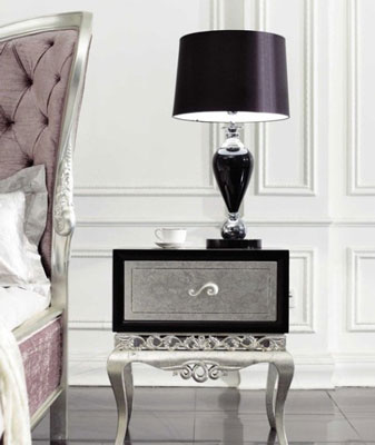 華麗的深紫色和深邃的黑色一起構成了這盞高貴典雅的歐式復古床頭燈。燈身一反常態的采用了黑色的玻璃,和床頭柜上的那一圈黑色輪廓相呼應,在一片銀色的家具中顯得尤為醒目。紫色本就是高貴和氣質的代表,采用了布藝的材質更加為這層氣質增添了不少含蓄和低調。