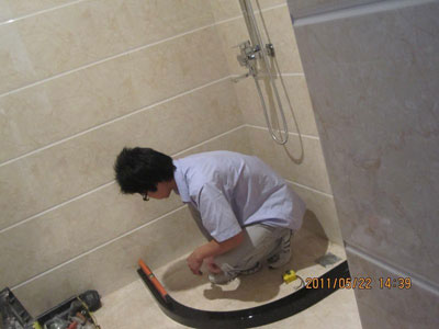 3、淋浴房地面漏水(一者徹底解決翻掉地磚重新鋪設(shè),二者在地磚交接縫表面用切割機(jī)割一道2~3MM凹之后,再用瓷白中性玻璃膠重新打一道,節(jié)約可用3~5年,但不是長久).