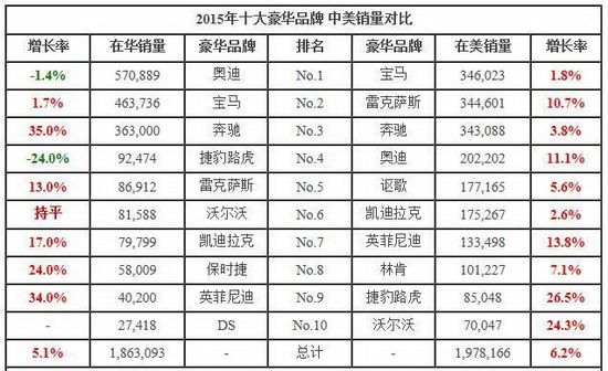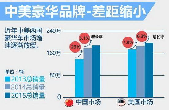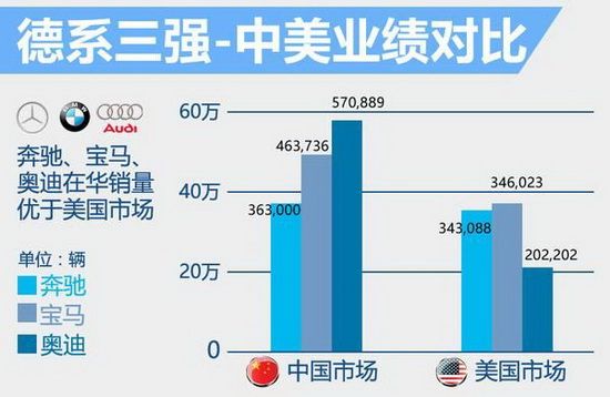 2015年中國豪華車市場,梅賽德斯-奔馳成為增長最迅猛的豪華品牌,同比大漲35%至363,000輛,市場占有率達(dá)到17.3%,并超越美國成為全球最大單一市場。寶馬(含MINI(參配、圖片、詢價) 品牌)在華銷量業(yè)績再創(chuàng)新高463,736輛,遠(yuǎn)超美國市場346,023輛的銷量成績。奧迪品牌2015年雖然在華銷量首次出現(xiàn)負(fù)增長,同比下滑1.4%至570,889輛,不過業(yè)績?nèi)猿矫绹袌鼋?倍。