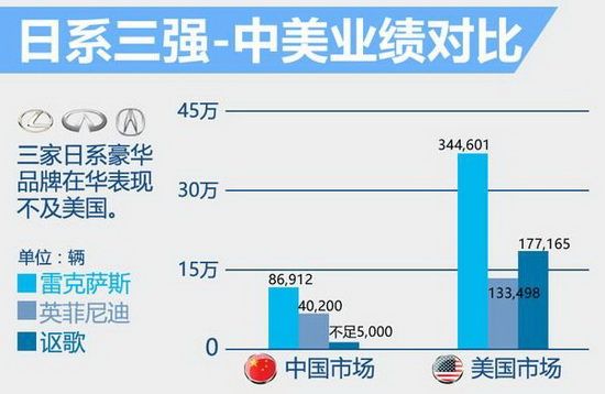 在中國市場兩大日系豪華品牌雷克薩斯和英菲尼迪的銷量業(yè)績雖然保持高速增長,但相比美國市場的體量仍有很大差距。其中雷克薩斯在美國2015全年銷量已達(dá)到344,601輛,同比增長10.7%,市場占有率達(dá)到17.4%,與美國市場銷量第一的寶馬品牌僅差1,422輛的微小差距,仍是該品牌全球最大的單一市場。英菲尼迪亦是如此,2015年在美國市場銷量達(dá)到133,498輛,遠(yuǎn)超中國市場40,200輛的業(yè)績。