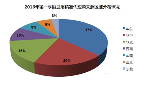 2016年第一季度意向代理商主要集中于華東與華中地區,總占比達到57%。這是與衛浴品牌的分布區域以及市場的發展相關。華東地區一帶是衛浴品牌的集中分布地區,目前需求量旺盛。華中地區經濟目前處于發展階段。較有代表性的是河南。第一季度代理商數量最高值出現在河南,該省人口數量較多,衛浴品牌少,市場尚未達到品牌飽和,代理商需求量大。因此,對于目前市場空間較大的華東、華中地區,企業可在品牌宣傳上多下功夫。
