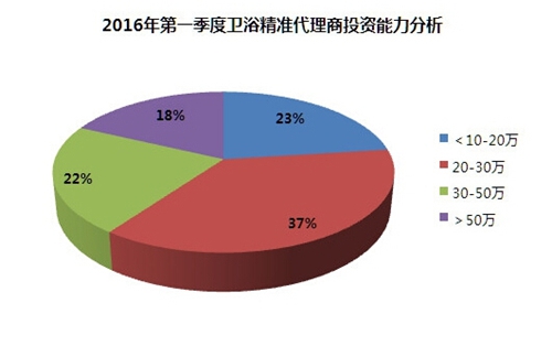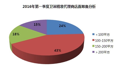 2016 年第一季度精準代理商店面籌備面積與投資能力中,其中店面籌備面積在100平方到200平方的占61%,投資能力在20萬到50萬的占59%。原因是在發展較為成熟的衛浴行業,對于投資能力與店面面積有較高要求的一線品牌已基本布局完畢,二線品牌的招商需求處于較為旺盛的階段。