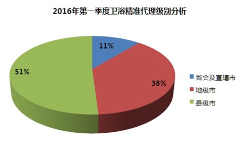 隨著一二線城市的家居建材市場接近飽和,很多品牌開始渠道下沉,進攻三四線城市、甚至農村市場。這一趨勢在發展已經成熟的衛浴行業表現得更為明顯。從2016年第一季度衛浴精準代理級別分析數據來看,縣級市的代理商占比51%,而省會級直轄市僅占11%。同時,隨著國家近年在縮小貧富差距方面對縣城、農村的政策偏向,縣域經濟將進一步得到激活與發展,與生活品質緊密相關的家居建材也將迎來機遇,在一二線城市的市場接近飽和的情況下,渠道下沉無疑是衛浴企業未來較長一段時間的布局方向。