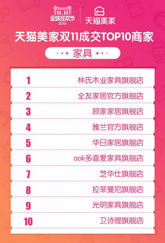 林氏木業以單店成交過5億、集團成交超6億的成績繼續蟬聯天貓美家行業TOP1,第二名和第三名全友家居和顧家家居品牌成交均超3億,并分別取得成交增長近100%和200%的傲人成績。雅蘭、華日家居和aok多喜愛家具均為今年首次過億品牌,其中主打兒童家具的aok多喜愛家具成為今年家具行業的最大黑馬。