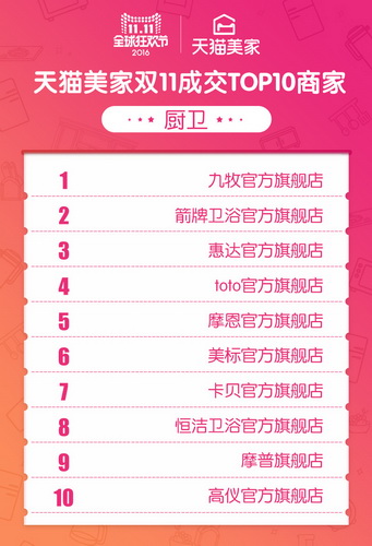九牧官方旗艦店雙11單日成交首次突破2億,連續7年在衛浴行業登頂,同比去年接近100%增長,其爆款花灑單品熱賣近10萬件。箭牌衛浴緊隨其后,其官方旗艦店成交首次破億;惠達在2016年雙11于智能衛浴和O2O發力,智能馬桶爆款單品銷售破萬臺,單品銷售額輕松突破3000萬;而在智能馬桶蓋類目,松下、TOTO、科勒繼續保持穩定增長,衛洗麗官方旗艦店入駐天貓不到半年,雙11銷售即告突破1000萬,成為廚衛界黑馬之一。