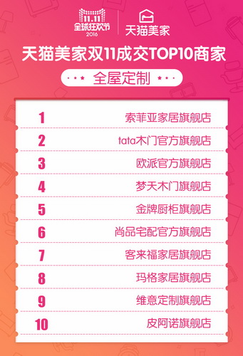 作為全屋定制行業領導性品牌,索菲亞從價格透明化到服務確定性不斷升級,從單品解決方案到用戶解決方案不斷突破,與天貓在全渠道品牌營銷、大數據用戶畫像、技術合作及金融合作上全面對接,獲得行業TOP1實至名歸。單品極致的領軍品牌tata木門具備極致性價比和廣泛的年輕人群認知基礎斬獲了門行業TOP1和全屋定制行業TOP2,而夢天木門和金牌櫥柜作為行業的高端品牌,其榜上有名正反映消費者對消費升級、品質升級的需求。尚品宅配首次公開參戰天貓雙11即斬獲TOP6,是最具發展想象力的品牌,潛力無限。定制家居行業的無冕之王歐派集團后發先至實力不凡,歐派高端全屋定制和瑪格實木定制的全面爆發更是說明了消費升級背景下的用戶解決方案替代單品解決方案的大行其道。