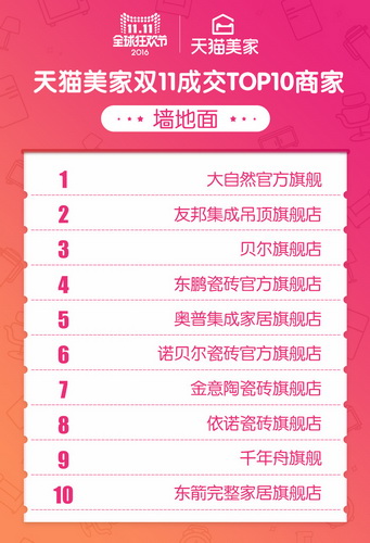 東鵬瓷磚位列瓷磚類第一,本次雙11其零售體系內近3000家門店接入到雙11萬店同慶聯合營銷活動——“全球雙11,BUY家”活動。雙11當天東鵬累計成交8500筆全屋瓷磚訂單,所有訂單全部由東鵬實體門店提供統一的“陽光服務,六次到家”服務。