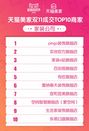 互聯網整裝品牌PINGO國際作為此次天貓雙11的頭號黑馬,一路領跑最終以突破4億的成交額勇奪家裝公司狀元。榜眼則被實創裝飾奪下,成交額超3億元,完美家裝一經亮相,全國驚艷,客單價翻了近300%,北京單城破億。家裝e站作為首家破億的O2O老將,持續夯實線下根基,保持了良好的增長勢頭,獲得探花。從榜單可見,老牌勁旅如百安居、生活家、東易日盛和互聯網新秀有住、塞納春天、愛空間、宜和宜美(全屋軟裝No.1)齊頭并進,轉型與升級成為家裝“新零售”的主旋律。