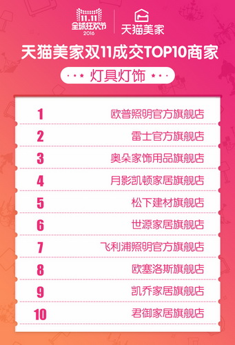 歐普照明連續四年登頂燈具燈飾行業TOP1,且今年品牌實現雙11單日突破兩億的新記錄。另外,花燈商家占據燈具燈飾TOP10的六成,主要得益于今年雙11主打的花燈風格套餐,這些精選搭配的極具性價比的套餐,節省了買家的挑選時間,得到了消費者的高度認可。