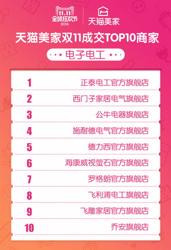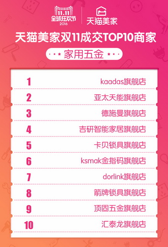 家用五金類目TOP10幾乎都被智能門鎖品牌霸占,消費升級在這個雙11體現得淋漓盡致,且增長勢頭良好,說明相對傳統機械鎖,消費者對智能門鎖的接受程度越來越高。其中凱迪仕智能鎖是去年的類目TOP1,今年繼續保持領先,三星智能鎖增長勢頭也很迅猛,開賣10小時便超過了去年雙11全天銷售。