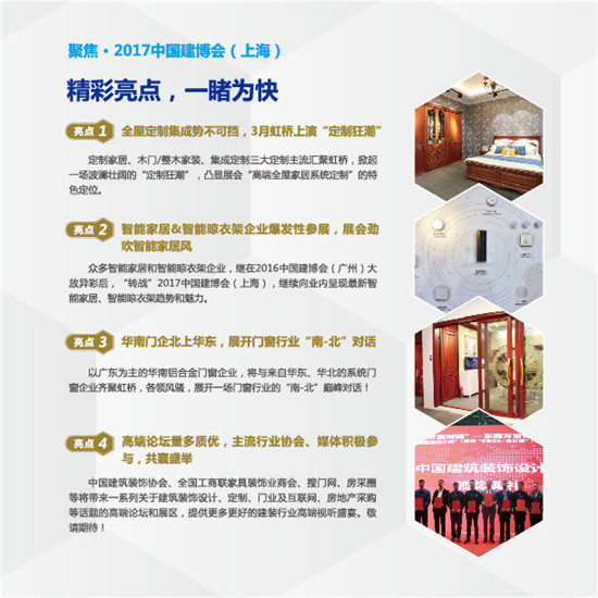 新:中國建博會作為建筑裝飾行業“冠軍企業首秀平臺”,旨在為業界同仁搭建一個展示新產品、新技術、新設計、新舉措的大舞臺。展會每屆都固定在7月8日開幕,而這一天在行業的自發推動下,已歷史性、市場化地發展成為中國建筑裝飾行業的“大年初一”,各路英豪競相在這個平臺上展示其最新、最好也是最為亮麗的一面。