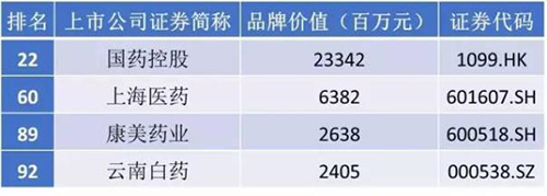 總榜Top100中,醫藥生物行業共有4家企業上榜,數量位列全部27個小類別的第9名,4家企業分別是國藥控股、上海醫藥、康美藥業和云南白藥。
