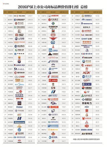 中國人民大學中國商標品牌研究院6月26日在京發布《2016滬深上市公司商標品牌價值排行榜》(“《排行榜》”)。《排行榜》由上市公司商標品牌價值總榜和行業分榜組成。總榜從全局的角度對滬深上市公司中最具價值的商標品牌進行了考察、排序,共有100家企業上榜。分榜選取了10個貼近終端消費者、體現中國制造概念并符合國家品牌發展戰略的細分行業,結合行業特點對行業知名商標品牌進行了排序。