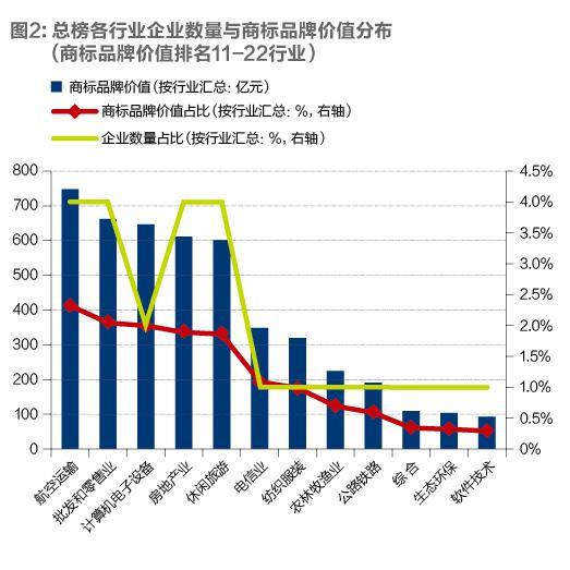 各分榜行業上榜企業品牌價值占對應行業上榜企業總市值的比重分別為:紡織服裝業47.84%、休閑旅游業42.55%、家用電器制造業32.39%、汽車整車制造業32.07%、傳媒業25.56%、醫藥制造業20.12%、食品飲料行業19.54%、公路鐵路運輸業17.81%、智能制造業14.60%、金融業14.29%。