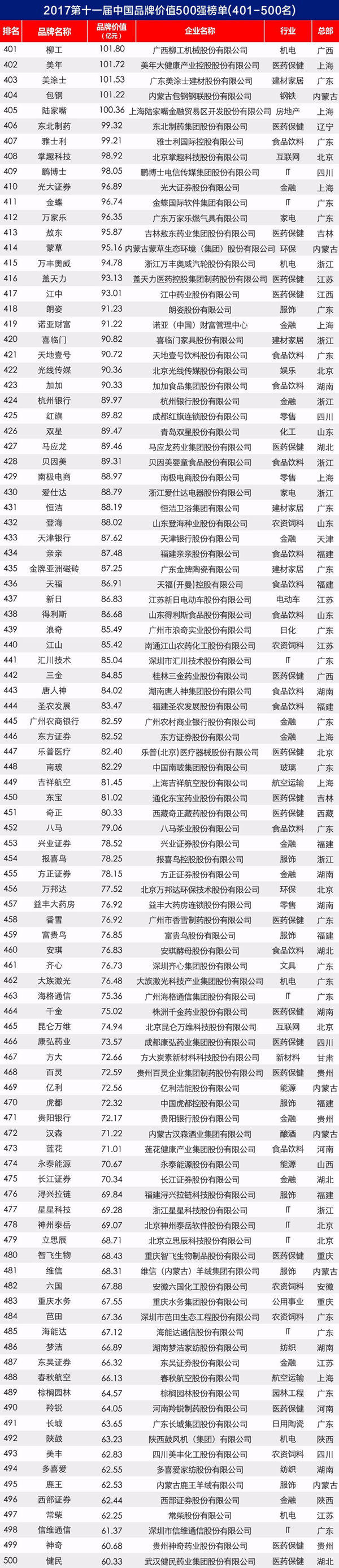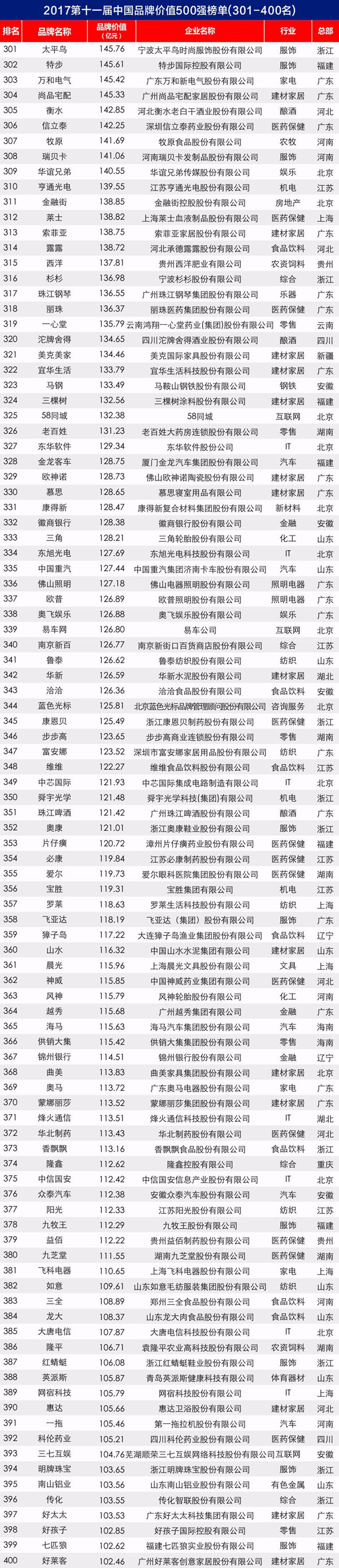 2017年12月18日,中國品牌價值 500 強評審委員會揭曉第十一屆中國品牌價值 500 強榜單。500個上榜中國品牌的總價值高達174627億元,平均每個上榜品牌的價值為349億元。2016年,平均每個上榜品牌的價值為261億元。2015年,平均每個上榜品牌的價值為 233億元。這表明,在過去一年里企業品牌價值的增長幅度超過34%,比上一屆 12% 的增幅有較明顯的提升。
