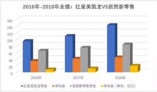 2018年,紅星美凱龍營業收入142.40億元,歸屬凈利潤44.77億元;居然新零售營業收入83.69億元,歸屬凈利潤19.62億元。