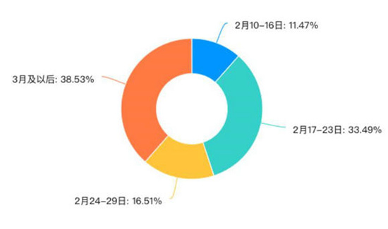 面對當前疫情嚴峻的防控形勢,218家企業中,在2月10日-16日之間開工的有25家,計劃在3月及以后才開工的有84家,占比38.53%。87.16%的企業最多能承受延遲開工15天至一個月時間。