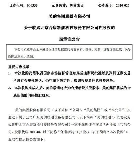 收購完成后,美的集團將通過美的暖通合計持有合康新能約20868萬股股份,并通過上豐集團及葉進吾委托的約5574萬股股份表決權,合計控制合康新能約26443萬股股份表決權(約占合康新能總股本的23.73%),成為合康新能間接控股股東。