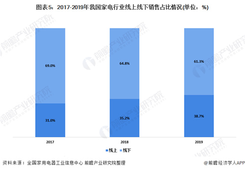 圖表5:2017-2019年我國家電行業線上線下銷售占比情況(單位:%)