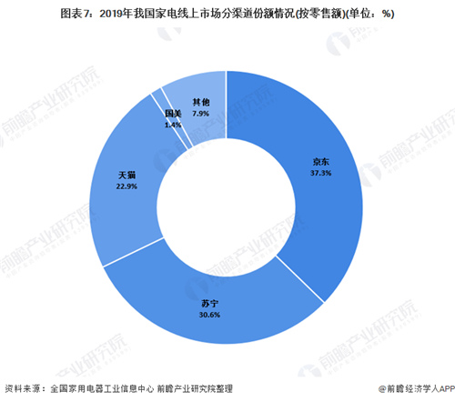 從線上銷售情況來看,我國家電線上渠道集中度較高,2019年線上家電銷售渠道市場份額分布中,京東、蘇寧、天貓分別以的市場份額位居前三,三者合計市場份額占比超過九成。