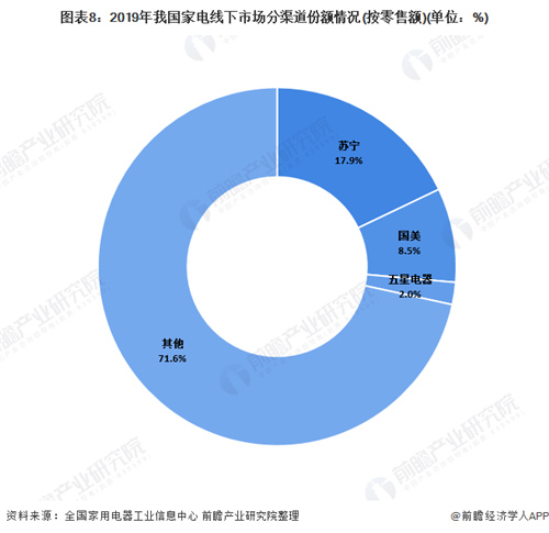 從線下銷售渠道來看,作為我國線下兩大重點流通渠道,蘇寧和國美市場份額相對穩定。2019年蘇寧以17.9%的份額位居市場首位,國美以8.5%的份額位居第二。