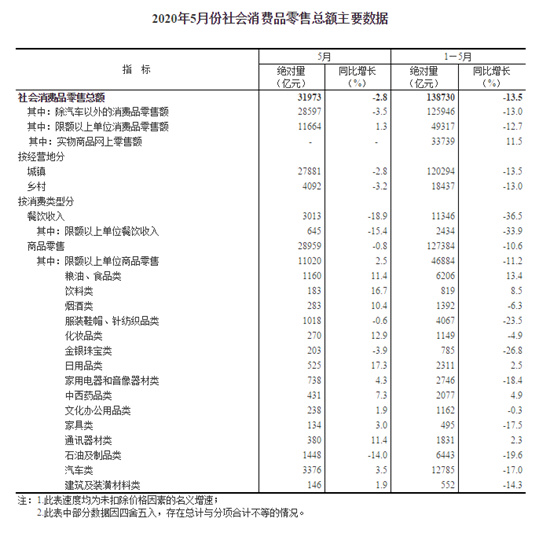 按經營單位所在地分,5月份,城鎮消費品零售額27881億元,同比下降2.8%,降幅比上月收窄4.7個百分點;鄉村消費品零售額4092億元,下降3.2%,降幅比上月收窄4.5個百分點。1—5月份,城鎮消費品零售額120294億元,同比下降13.5%;鄉村消費品零售額18437億元,下降13.0%。
