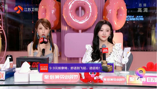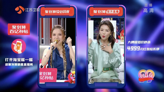 區(qū)別貓晚的綜藝狂歡,江蘇衛(wèi)視與淘寶聯(lián)合打造的全網(wǎng)首個全明星晚會——聚劃算99劃算夜,則邀請明星進入直播間,進行沉浸式體驗,并以一大一小兩屏的呈現(xiàn),為用戶帶去福利+好物推介的購物歡樂。