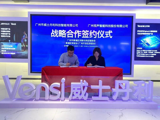 11月6日上午,Vensi威士丹利智能和視聲股份在威士丹利總部廣州舉行戰略合作簽約儀式,威士丹利高層、視聲股份簽約代表、廣州市黃埔區采購與供應鏈協會會長、廣州開發區貿促會會長共同見證精彩時刻。