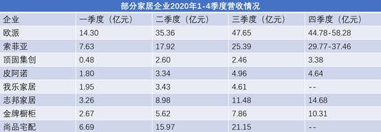 從營(yíng)收來(lái)看,2020一到四季度,大多數(shù)企業(yè)營(yíng)收保持持續(xù)增長(zhǎng),且在三、四季度增長(zhǎng)明顯。其中,家居行業(yè)首個(gè)市值破千億的歐派家居,一到四季度營(yíng)收變化比較明顯。歐派家居三、四季度的營(yíng)收近百億,與上半年相比,增長(zhǎng)率超80%。