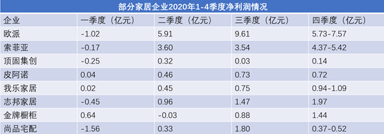 不過(guò),單從凈利潤(rùn)來(lái)看,依然有部分企業(yè)在2020年四季度出現(xiàn)下滑。其中,歐派家居在2020年三、四季度歸屬上市公司股東凈利潤(rùn)為9.61億元、5.73-7.57億元。尚品宅配在2020年三、四季度歸屬上市公司股東凈利潤(rùn)為1.80億元、0.37-0.52億元。頂固集創(chuàng)在2020年三、四季度的凈利潤(rùn)明顯低于二季度。數(shù)據(jù)顯示,2020年二到四季度,頂固集創(chuàng)歸屬上市公司股東凈利潤(rùn)為0.32億元、0.03億元、0.14億元。