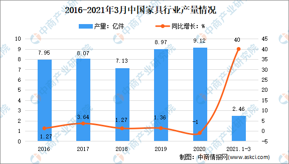 數(shù)據(jù)顯示,2021年3月,全國家具制造業(yè)完成產(chǎn)量9646.1萬件,同比增長23.0%。2021年1-3月,全國家具制造業(yè)完成產(chǎn)量24568.1萬件,同比增長40.0%。