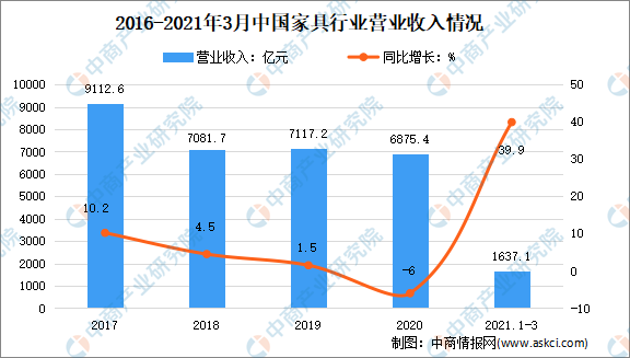 數(shù)據(jù)顯示,2021年1-3月全國家具制造業(yè)營業(yè)收入1637.1億元,同比增長39.9%;利潤總額67.3億元,同比增長72.6%。