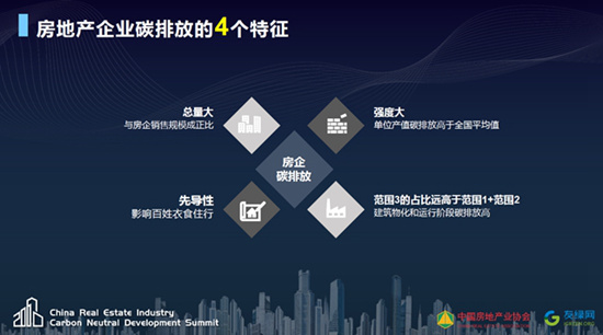 房地產企業碳排放有4個特征:一,總量大,全球排第三,房地產建筑業產生的碳排放除了中國、美國以外,算起來排在第三位,全世界要關注中國,中國要看房地產。二,強度大,單位產值的排放量,房地產行業是0.25公斤,比全國平均水平多了1倍。三,先導性,房地產業是帶動經濟增長的先導性產業。每投1元錢可以帶動1.4元的產出,對GDP增速的貢獻是35%,消耗了35%以上的鋼,30%左右的水泥。四,范圍3的占比遠遠高度于范圍1+范圍2。從這些特征可以看得出來房地產企業實現雙碳目標應該把著眼點放在產業鏈上下游碳排放的控制和碳中和技術的應用上。