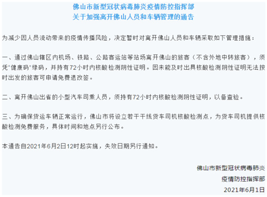 5月30日,廣州市新型冠狀病毒肺炎疫情防控指揮部發(fā)布通告,自5月31日22時起,通過廣州轄區(qū)內(nèi)機(jī)場、鐵路、公路客運(yùn)站等站場離穗的旅客(不含外地中轉(zhuǎn)旅客),須憑“健康碼”綠碼,并持有72小時內(nèi)核酸檢測陰性證明。同時,為確保貨運(yùn)車輛正常運(yùn)行,廣州市將設(shè)立若干干線貨車司機(jī)核酸檢測點(diǎn),為貨車司機(jī)提供核酸檢測免費(fèi)服務(wù)。“佛山發(fā)布”6月1日也發(fā)出通告,部分人離開佛山需憑“健康碼”綠碼并持有72小時內(nèi)核酸檢測陰性證明,6月2日12時起實(shí)施。