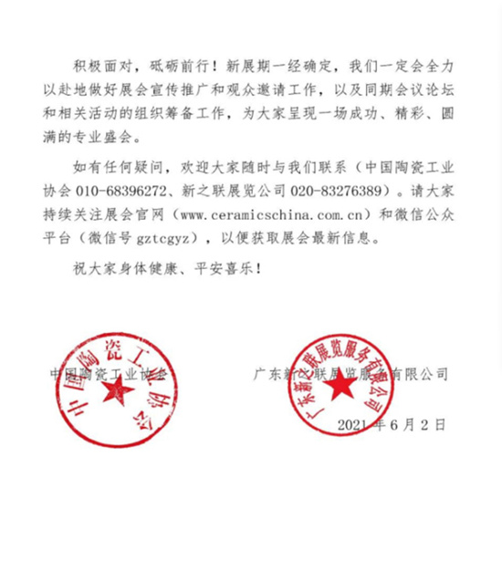 6月2日2021中國國際陶瓷工業(yè)技術(shù)與產(chǎn)品展主辦方發(fā)出《關(guān)于延期舉辦2021中國國際陶瓷工業(yè)技術(shù)與產(chǎn)品展覽會的通知)鑒于近期廣州及周邊地區(qū)突發(fā)本土疫情,結(jié)合廣東省和廣州市新冠疫情防控的有關(guān)要求,從保障參會人員健康安全的角度出發(fā),在認(rèn)真聽取了參展商、采購商、各省市陶協(xié)和媒體的建議后,我們決定將原定于2021年6月22至25日在廣州廣交會展館A區(qū)舉辦的“第35屆廣州陶瓷工業(yè)展”及“線上國際陶瓷工業(yè)展”延期舉辦(具體時間與展館確定后將在第一時間公布),展覽地點(diǎn)不變。
