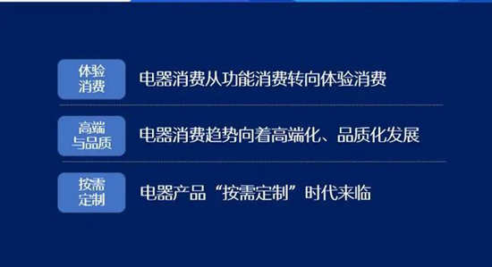 現在輿論一直在喊“消費升級”,但真正意識到或直接體驗到消費升級的場景卻一直模糊不清,消費升級到底在哪兒?“電器消費指數”就是一則實證,它反映出未來消費者在電器的使用體驗上將提出更高要求,越來越多人會把預算花在品質化、多樣化、個性化、定制化的產品上,對新品類的接受程度也將越來越高。