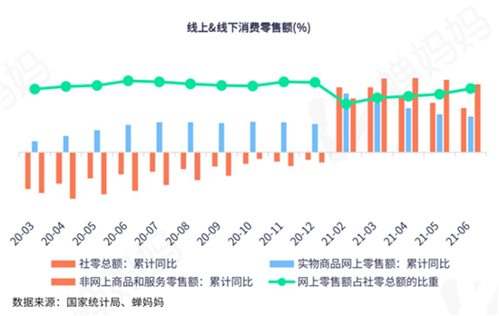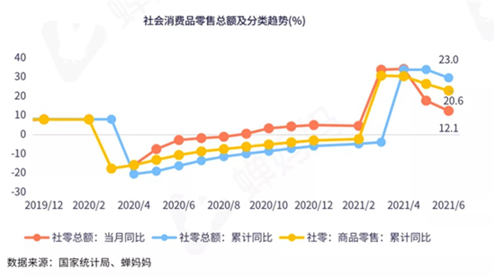 2021年6月社會消費品零售總額(以下簡稱社零)增速趨穩,當月同比增長12.1%,增速較5月的12.4%低0.3個百分點,消費品市場總體保持較好增長態勢。線上方面,受去年高基數影響導致累計同比增速延續下降態勢,1-6月網上商品和服務零售額累計同比降至18.7%。不過,從線上零售占比來看,受618電商年中購物節的驅動,6月線上零售占比繼續上調,達23.7%。整體來看,6月線上表現略優于線下。