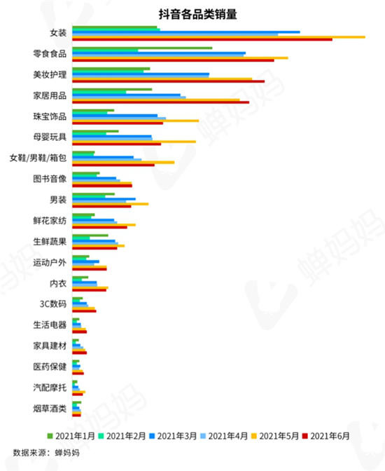 此外,從銷量絕對值來看,女裝、零食食品、美妝護理、家居寵物、珠寶飾品為全平臺銷量最高的五大品類;從銷量增速來看,醫藥保健(9.4%)、家具建材(8.6%)、美妝護理(6.9%)為全平臺銷量月環比增長最大的三大品類。