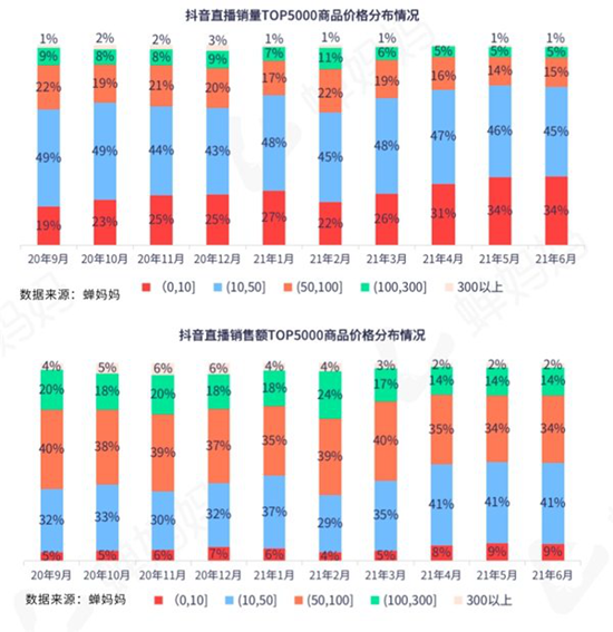 下圖為2020年9-2021年6月抖音直播月銷售額前5000名和月銷量前5000名商品的價格分布。從銷量TOP5000商品分布情況來看,由于抖音對下沉市場的滲透加大,加之新入局抖音直播者越來越多,“秒殺引流”玩法日漸常態化,客單價0-10元的商品占比自4月以來均超30%;此外,從各梯隊的商品占比變化來看,近3個月各梯隊的商品占比趨于穩定,具體來看,客單價在0-10元的商品占比由4月的31%微幅上調至6月的34%,客單價在10-100元的商品占比由4月的63%微幅下調至6月的60%,客單價在100元以上的商品占比維穩在6%。