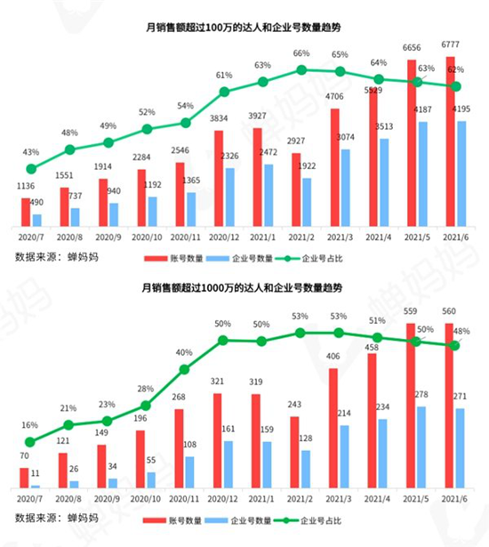 取品牌自播+短視頻品宣策略,探索線上轉化新路徑。但是,從達人帶貨月榜中企業號用戶數占比來看,月銷售額超過100萬的賬號中,抖音企業號用戶數占比自2021年2月觸達66%的高點后持續微幅下調,6月抖音企業號用戶數占比為62%;月銷售額超過1000萬的賬號中,抖音企業號用戶數占比自2021年2月觸頂后亦承壓下行。整體來看,目前無論是頭部主播達人,還是腰部達人(月銷售額超過100萬),企業號占比均處于高位回調階段,且仍未出現結束跡象。