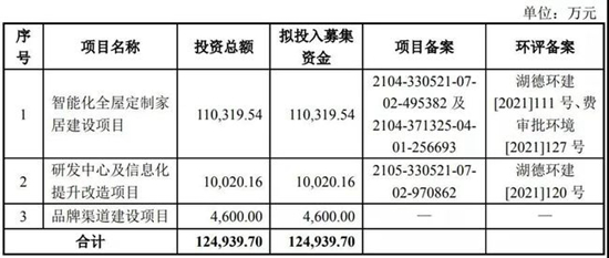 據云峰新材招股說明書,該公司擬發行A股股票不超過3166.67萬股,募集資金扣除發行費用后,將用于3大項目的投資,包括智能化全屋定制家居建設項目、研發中心及信息化提升改造項目、品牌渠道建設項目,其中智能化全屋定制家居建設項目投資金額11.03億元,占總投資金額近九成,顯示該公司正向全屋定制領域發力。