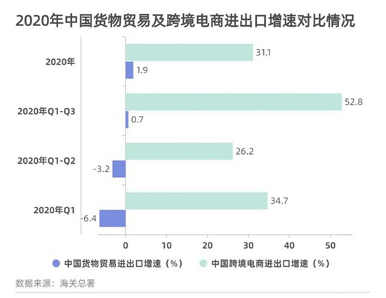 受新冠疫情影響,2020年外貿進出口低迷,至三季度實現由負轉正,而跨境電商進出口則逆勢增長,前三季度海關跨境電商監管平臺進出口1873.9億元,已超去年全年,大幅增長52.8%,為外貿進出口回穩做出突出貢獻。