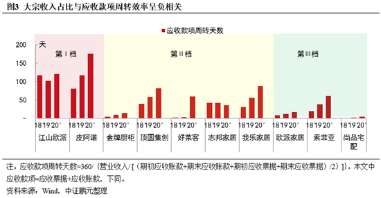 大宗業務拖累定制家居企業的運營效率及資產質量。受賬期影響,大宗業務收入占比高的企業應收款項占總資產的比重相對更高,江山歐派和皮阿諾3年平均占比均在25.00%以上;應收款項周轉天數顯著更長,江山歐派和皮阿諾3年平均應收款項周轉天數均在100天以上。從應收款項運營效率衡量,第I檔企業弱于第II檔,更弱于第III檔。樣本企業中江山歐派一直以大宗渠道為主,志邦家居在2017-2018年對大宗業務客戶結構進行調整,嚴格控制信用賬期,兩者應收款項周轉天數未有明顯增長。除此之外,其他樣本企業隨著大宗業務的逐步發力,應收款項周轉天數持續上升。由于房企資金緊張,皮阿諾、江山歐派、頂固集創、我樂家居等持有的恒大商票陸續出現逾期,據公開披露,目前的商討方案除商票展期之外,還有以房抵債。此外恒大已向索菲亞、皮阿諾、江山歐派提前轉讓合資子公司股權抵債或緩解資金緊張,隨著到期商票規模增加,相關企業回款質量持續弱化,應收款項減值風險上升。