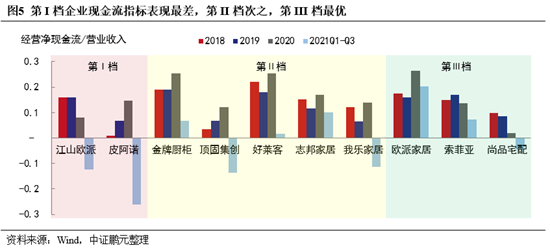 大宗業務占比高或大宗客戶風險大的樣本企業經營現金流弱化。2021年下半年以來房企流動性緊張,直接影響定制家居企業回款。江山歐派和皮阿諾經營現金流指標在2021年1-9月出現明顯的下滑,頂固集創由于積極推進大宗業務,業務合作保證金支出較大拖累經營現金流,我樂家居2021年半年報顯示其應收賬款前五大均為恒大地產、華夏幸福及金科地產的關聯企業。尚品宅配不涉及大宗業務,其經營現金流指標弱化則是由于戰略調整,全面轉型整裝業務所致。