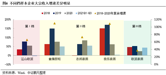 從三年復合增速看,江山歐派以大宗業務為主業,其增速水平仍然不低,金牌廚柜、志邦家居、我樂家居均保持了70%以上的增速,歐派家居增速最低。從2021年前三季度大宗業務增速來看,三檔企業分化更加明顯。歐派家居仍保持增長,江山歐派已出現負增長,第II檔的我樂家居增速也受到重創。金牌廚柜和志邦家居增速受影響較小,主要是金牌廚柜的代理模式占比高,志邦家居調整客戶結構后恒大等高負債客戶合作量大幅下降所致。